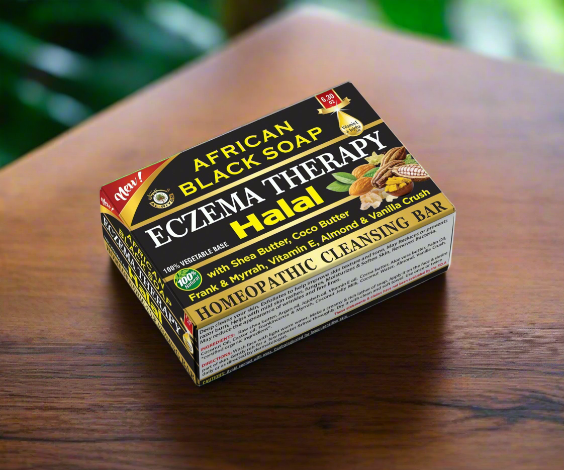 AFRICAN BLACK SOAPS FOR ECZEMA THERAPY VEGETARIAN SOAP WITH SHEA BUTTER, COOC BUTTER, VITAMIN E, FRANK & MYRRAH, ALMOND & VANILLA CRUSH.